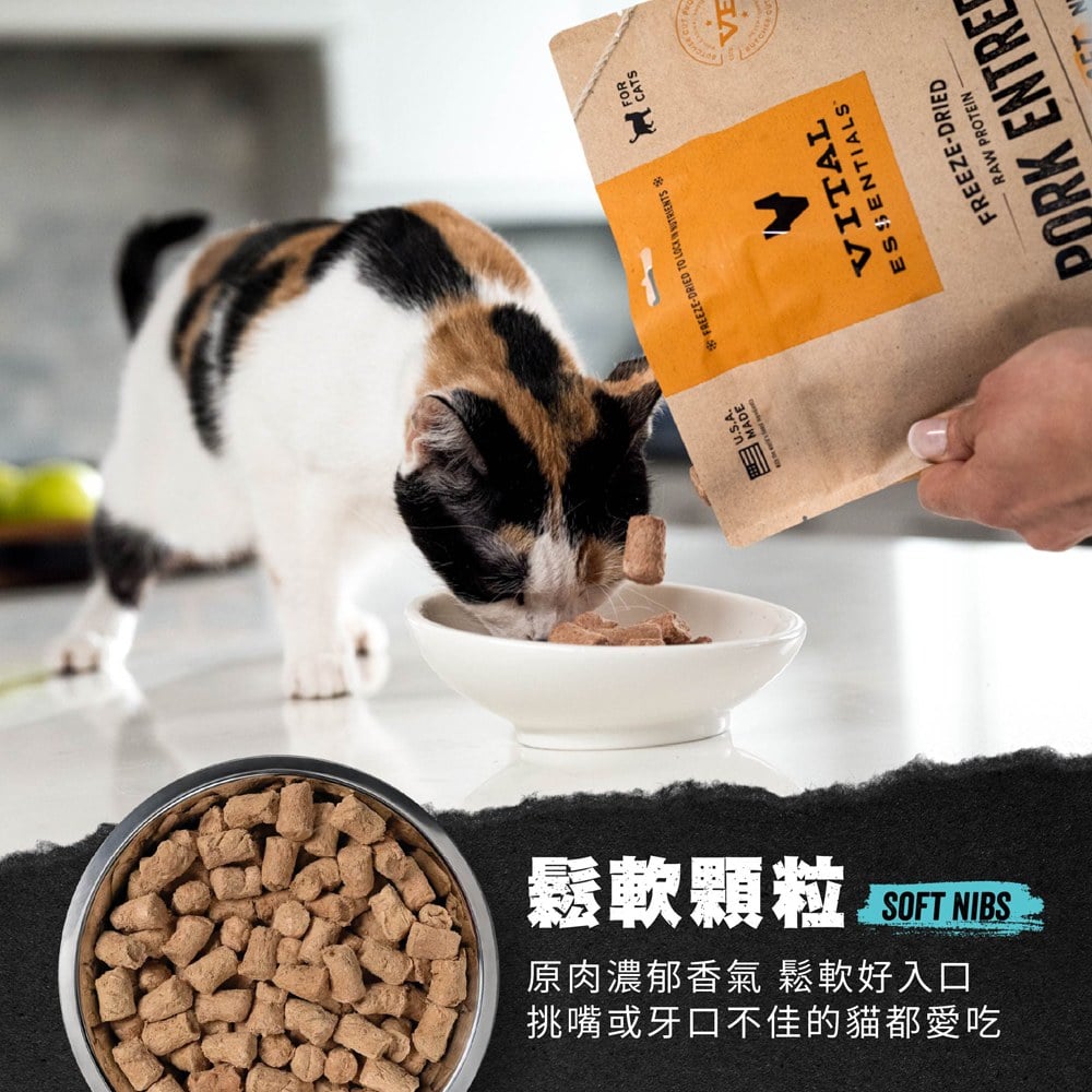 - 來自美國「VITAL ESSENTIALS」,採用全球獨創分離溫層技術,最大程度保留天然營養與原始風味。鬆軟顆粒牙口相對友善,老貓老犬必吃。