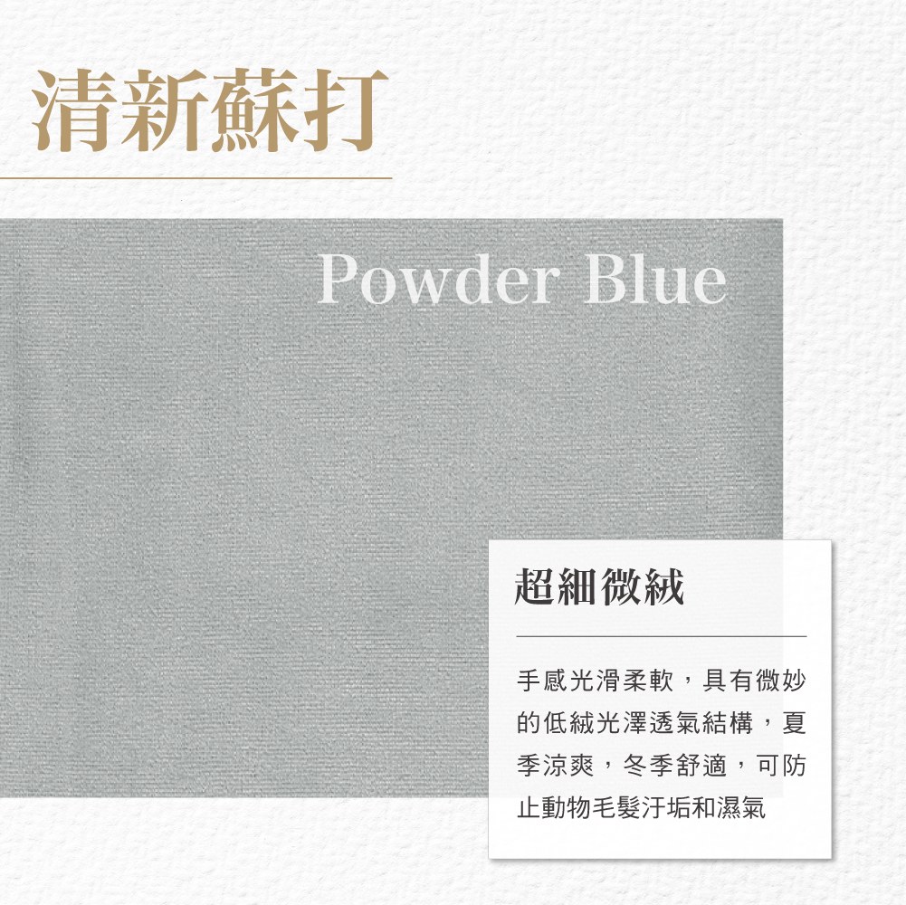 微天鵝絨:現代居家設計材質,融合天鵝絨的觸感,舒適細緻。 薄霧藍色調飄渺迷幻,可無縫融入任何居家擺設,好看又百搭。