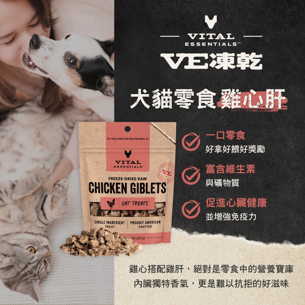 - 來自美國「VITAL ESSENTIALS」,採用全球獨創分離溫層技術,嚴選屠宰級完整鮮肉塊,並於45分鐘內即進入急速冷凍流程,再透過低溫冷凍乾燥製程,最大程度保留天然營養與原始風味。